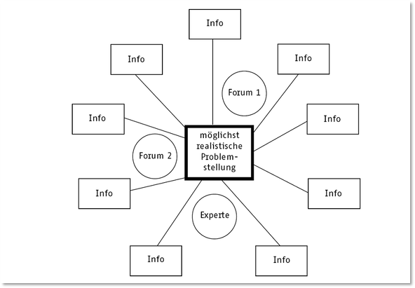 Dabei können weitere Informationsquellen in Reichweite liegen: Foren, in denen kooperativ mit anderen Lernern an der Lösung gearbeitet werden kann oder Experten, die zur Lösung befragt werden können (das können Personen oder Plattformen wie z. B. Wikipedia sein). Die Lösung des Problems ist nicht (eindeutig) vorherbestimmt, sondern individueller Natur.